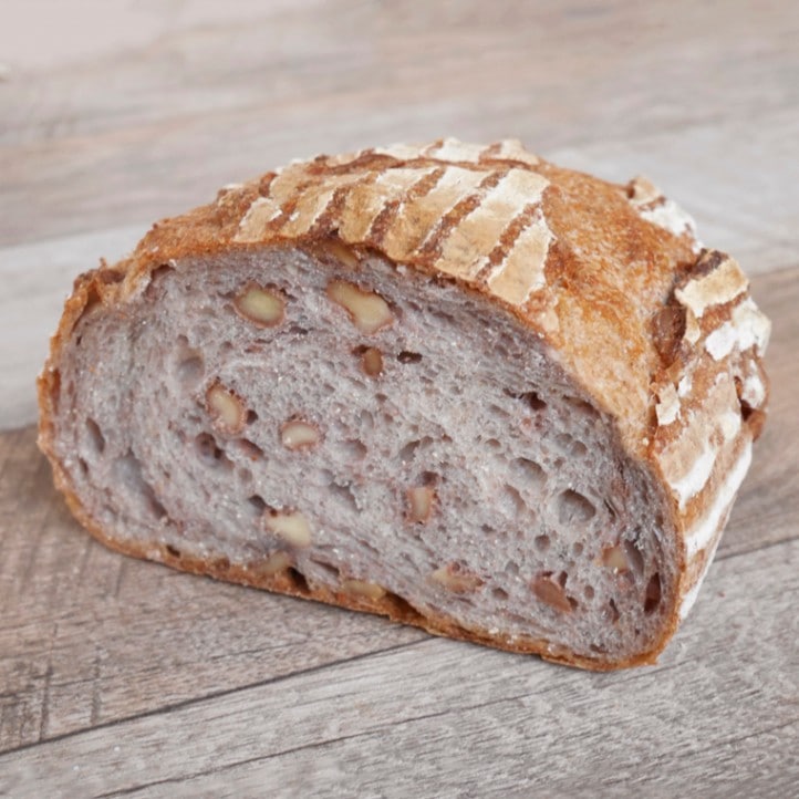 2種類のルヴァン種(自家製培養酵母)と石臼で挽いた国産の全粒粉を使用。香ばしいクルミを加えて焼き上げた生地の甘み、ほどよい酸味が特徴の食事パン。※国産小麦全粒粉8%使用(穀類対比)